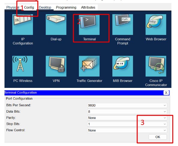 2. Akses Switch dengan PC0 melalui aplikasi terminal yang terdapat pada PC0
