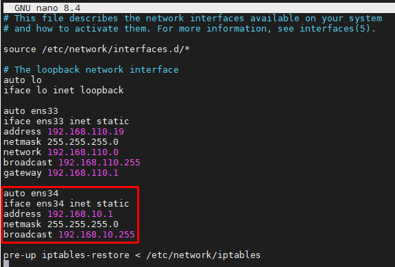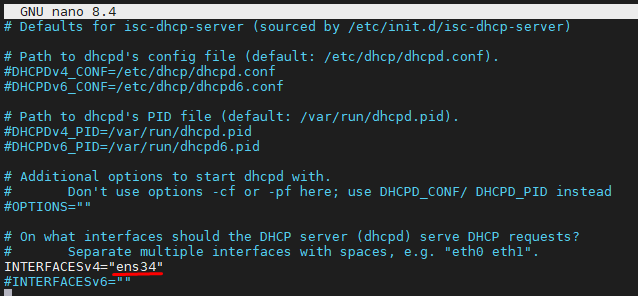 Sesuaikan ens34 dengan nama ethernet Anda yang di gunakan untuk ke client, dan berikan tanda # pada baris INTERFACESv6