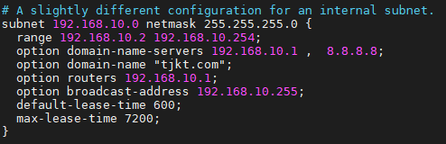 Kemudian hilangkan tanda # mulai baris Subnet hingga } lalu sesuaikan konfigurasi nya