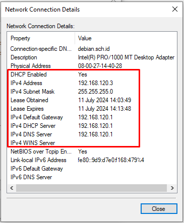 Hubungkan pc client Anda dengan server, lalu seting network nya secara dhcp, dan pastikan pc client Anda mendapatkan IP dari server Debian Anda