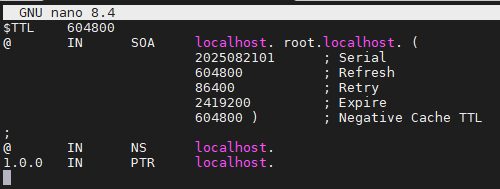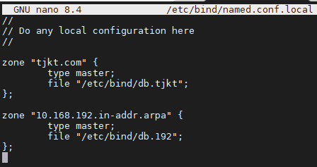 Untuk membuat zone domain, lakukan pengubahan pada file named.conf.local