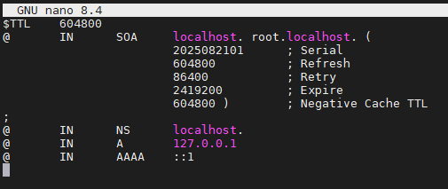 Pada Debian versi 12 dan sebelumnya, sudah menyediakan fle konfigurasi standar yang telah ada dengan nama file db.local, sehingga bisa kita manfaatkan hanya dengan mengcopy file db.local lalu mengkonfigurasi sesuai dengan yang kita perlukan. Namun pada Debian versi 13 file tersebut sudah tidak tersedia.