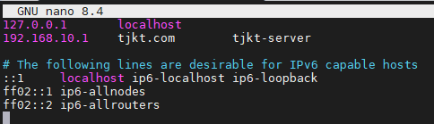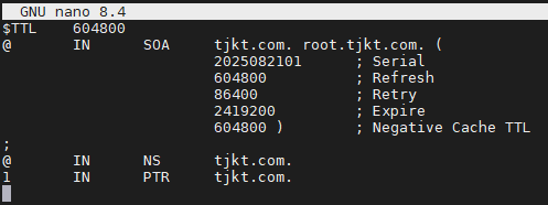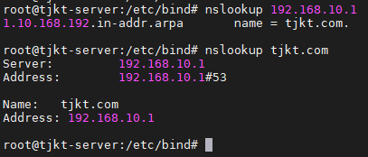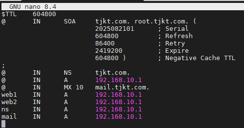 Sesuaikan nama domain dan IP yang digunakan (tjkt.com) dan ip (192.168.10.1) yang akan digunakan