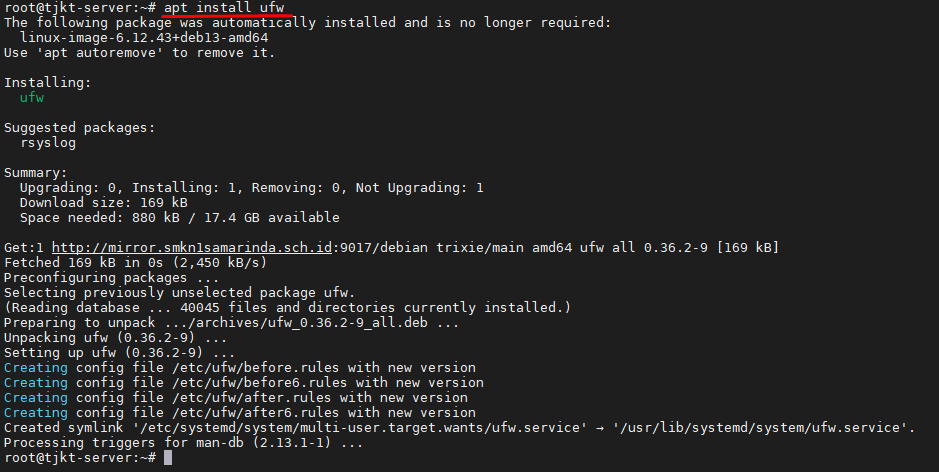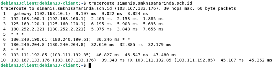 Fungsi NAT (Network Address Translation) di Debian 13 (atau versi Linux lainnya) adalah menjembatani jaringan lokal (LAN) dengan internet (WAN) dengan menerjemahkan alamat IP privat (internal) menjadi satu atau beberapa alamat IP publik, sehingga menghemat alamat IP, meningkatkan keamanan dengan menyembunyikan struktur jaringan internal, serta memungkinkan banyak perangkat berbagi koneksi internet melalui satu IP publik. Debian digunakan sebagai router dengan NAT untuk membagi akses internet ke perangkat lain dalam jaringan.