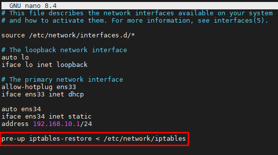 Buka file interfaces dan tambahkan scrip berikut dipaling bawah, agar supaya setingan iptables yang kita buat selalu di jalankan setiap kali server di aktifkan pre-up iptables-restore < /etc/network/iptables