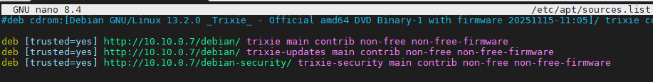 deb [trusted=yes] http://10.10.0.7/debian/ trixie main contrib non-free non-free-firmware