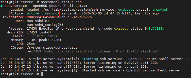 Pastikan service ssh tersebut active (running), jika tidak silahkan cek kembali konfigurasi file sshd_config