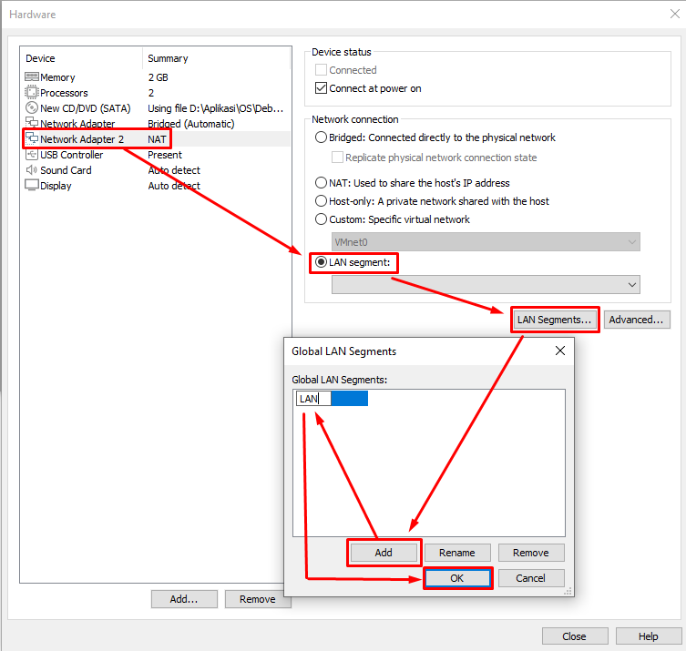 - Ubah Network Adapter yang kedua menjadi Lan Segment