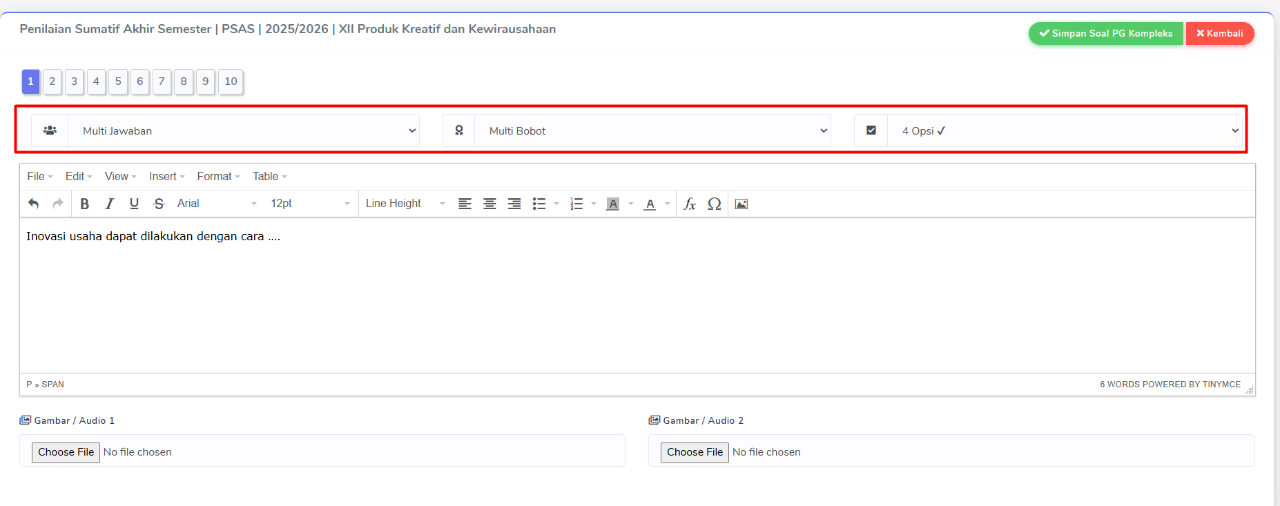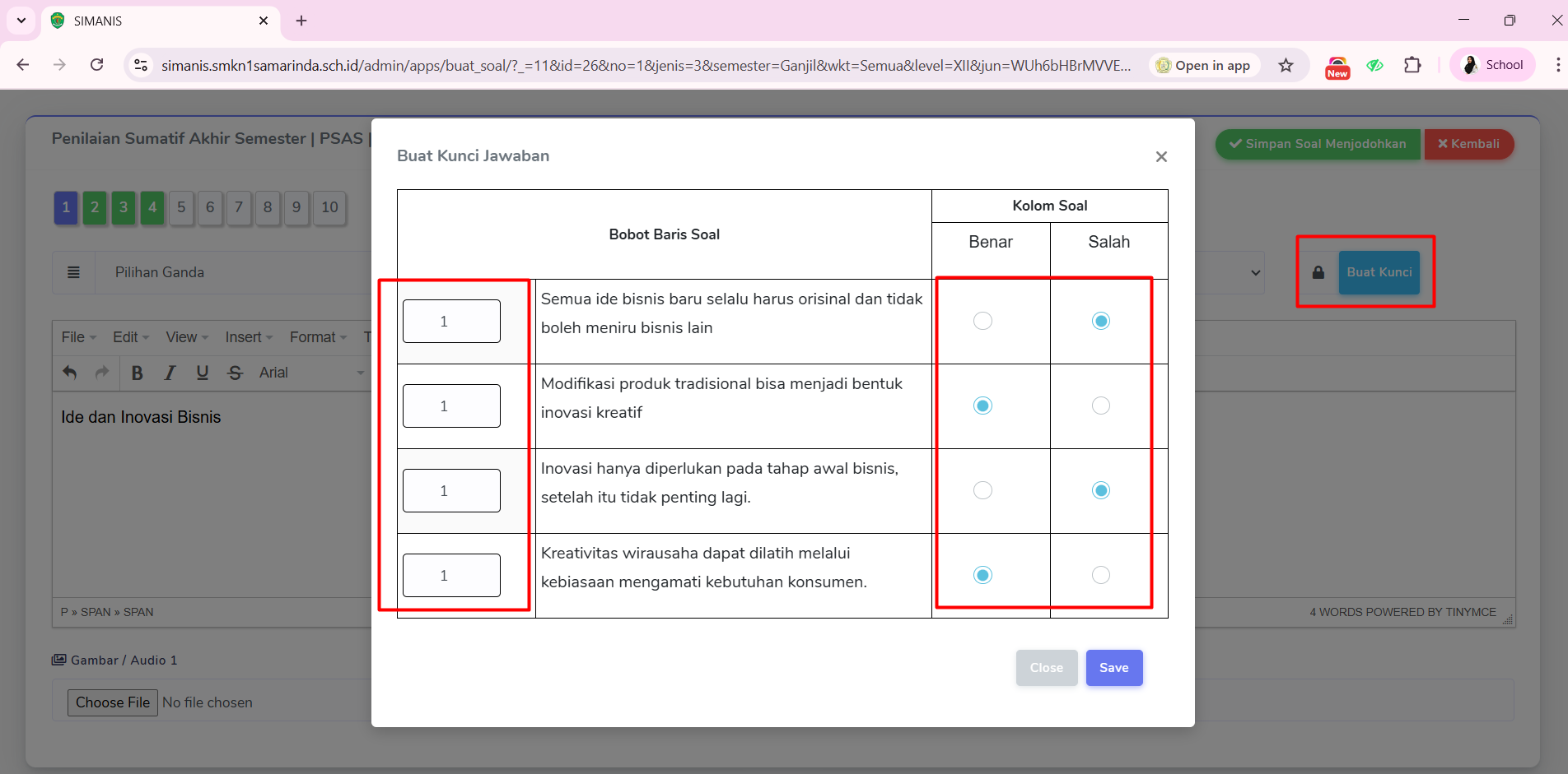 - Klik pada Soal PG Multi Opsi dan Bobot sesuai Contoh pada gambar (Soal tampil 20 soal dengan Bobot 20%)
